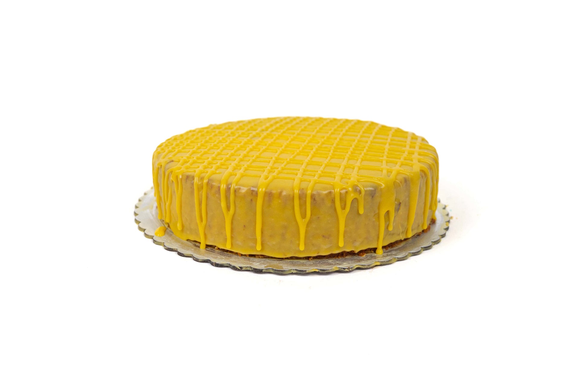 A moist banana mudcake made from real bananas, covered in a banana ganache.
