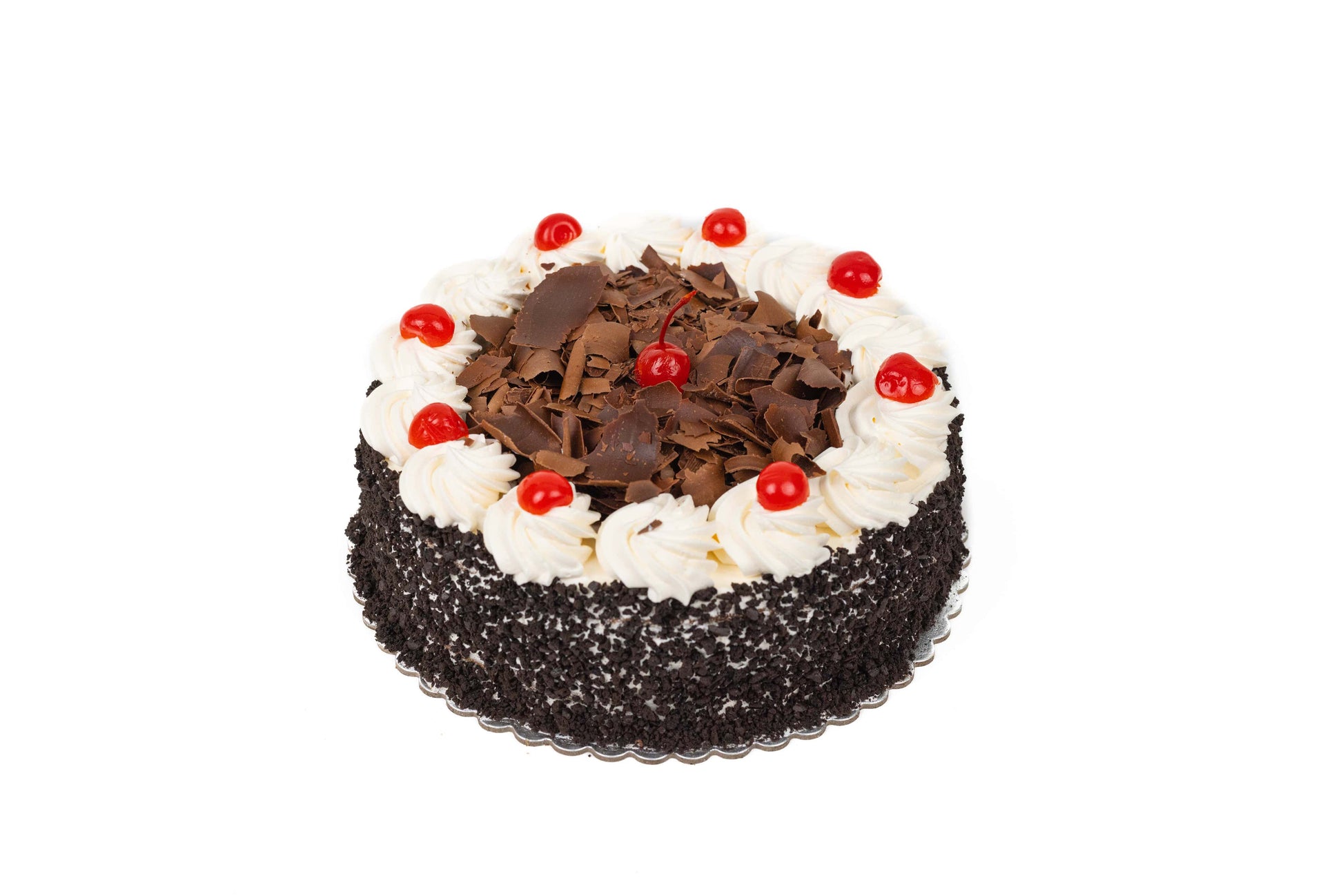 A triple layered chocolate sponge cake with layers of fresh cream and sour cherries. Topped with grated chocolate and cherries. One of our most popular cakes.