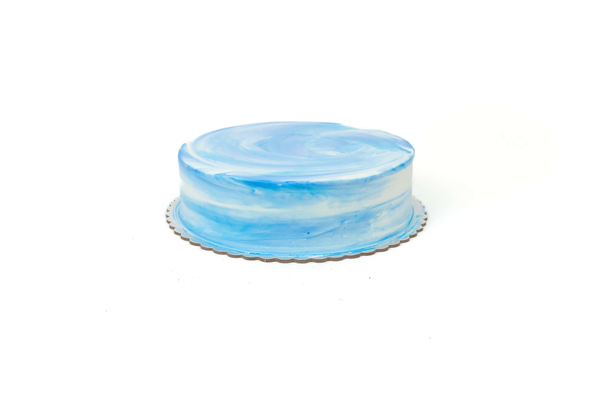 A blue vanilla sponge cake with fresh cream layers. Decorated with a blue and white water colour look, topped with a small Happy Birthday sign. Great for kids birthdays!