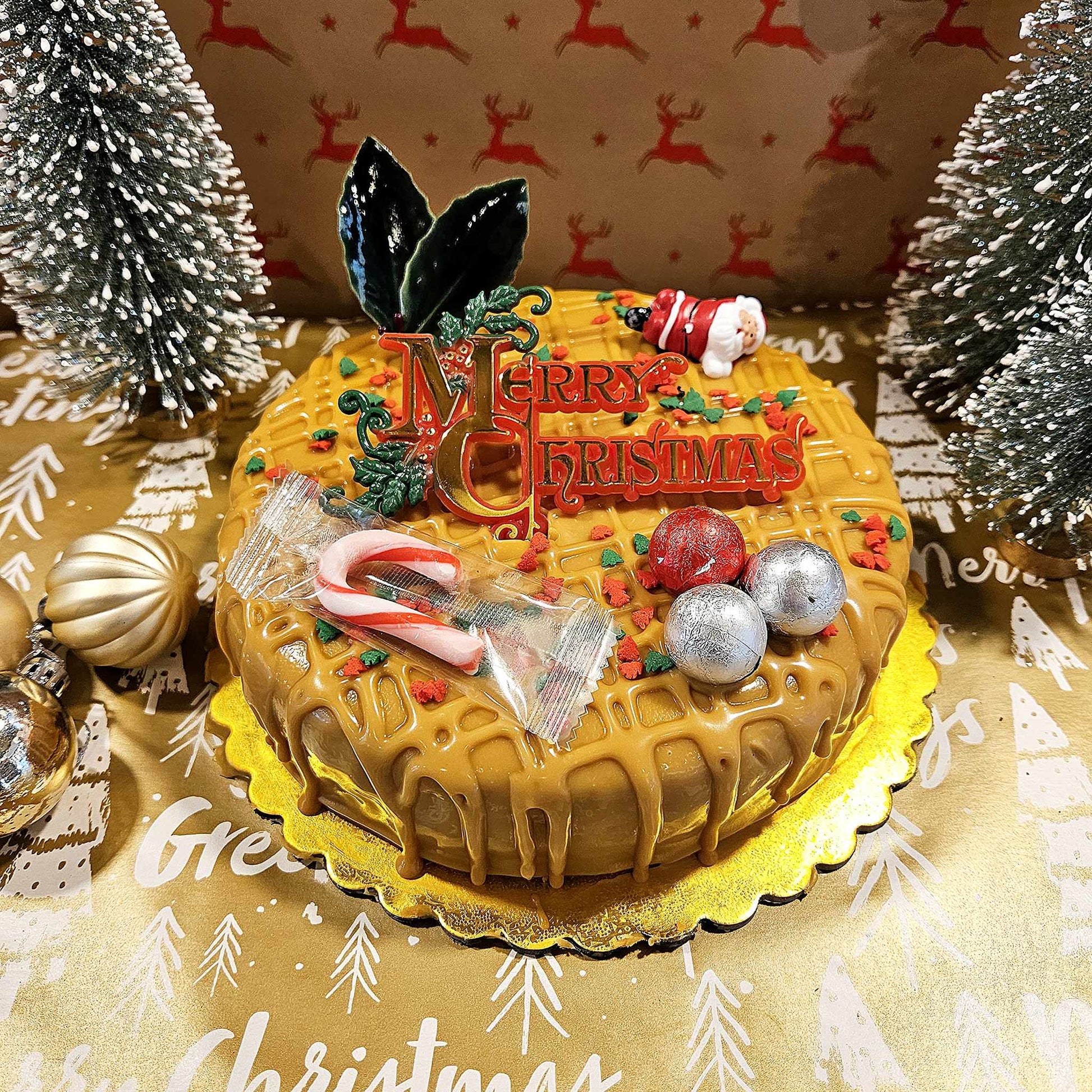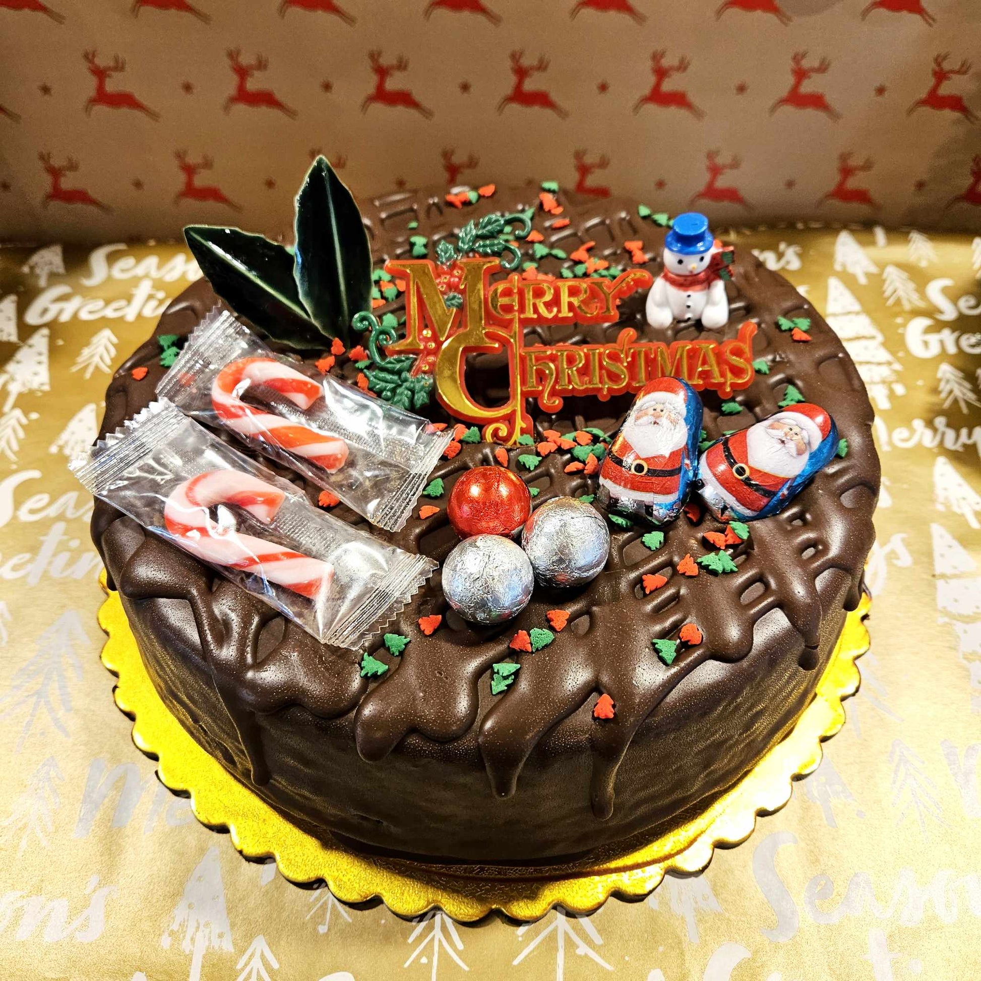 Our rich delicious Mud Cake topped with an assortment of festive Christmas Decorations.