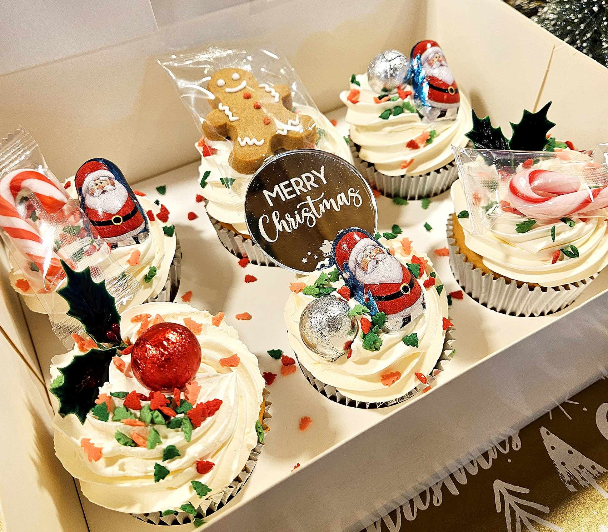 A mix of chocolate and vanilla cupcakes decorated with a swirl of cream and assorted Christmas decorations and treats.
