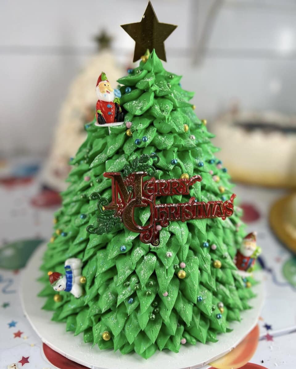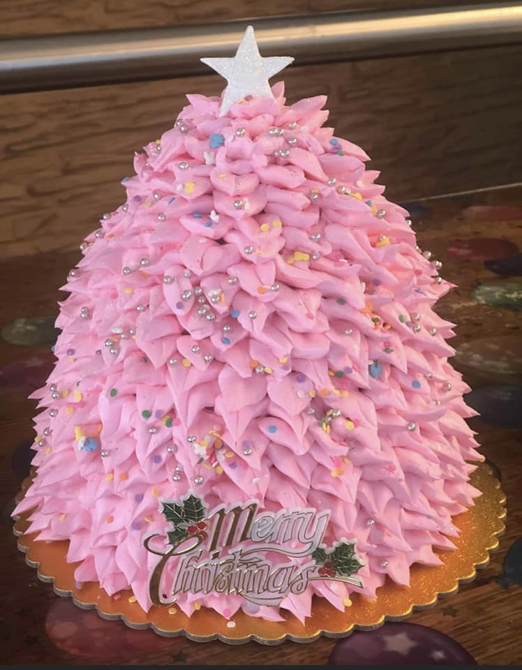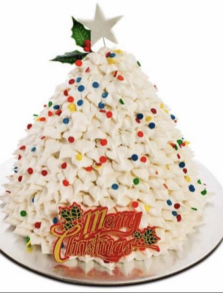 A wonderful Christmas centre piece. A beautifully piped Christmas tree made from chocolate or vanilla sponge with layers of fresh cream.