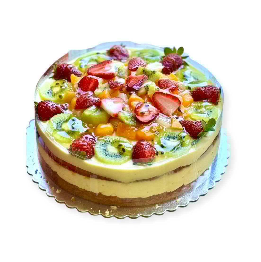 A vanilla sponge with a layer of vanilla custard topped with strawberries, kiwifruit, passionfruit and other mixed fruits. Our Fruit Flan is the perfect accompaniment for any summery occasion.