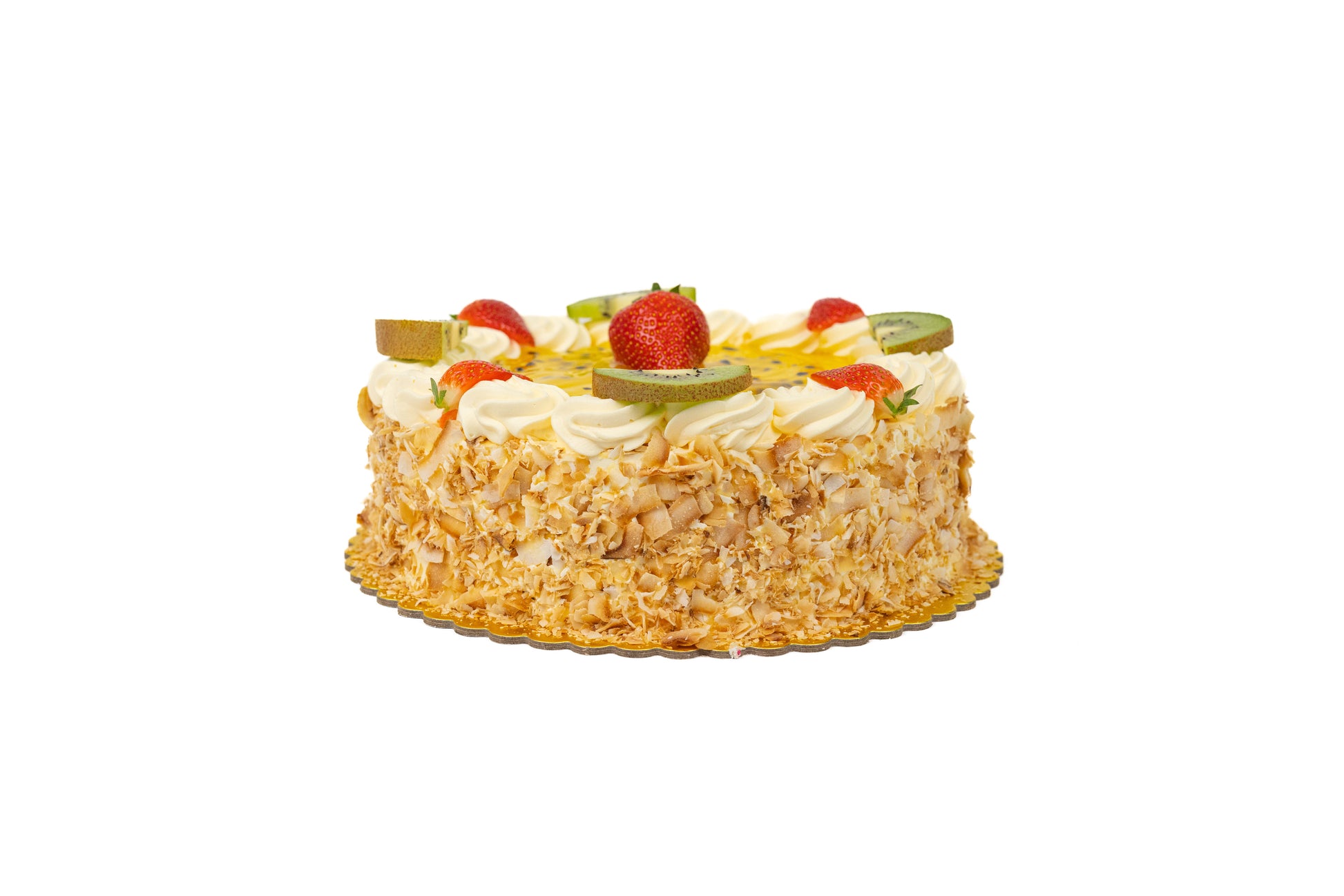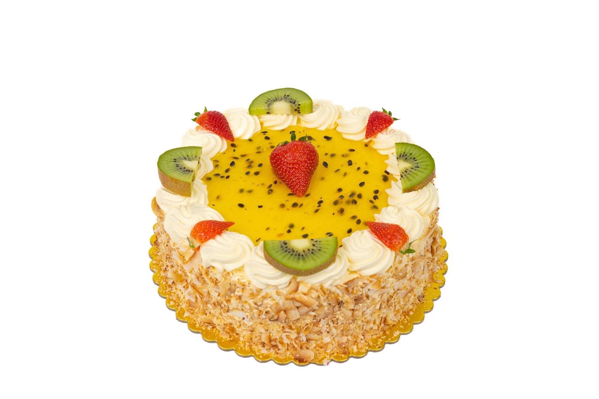 A light vanilla sponge cake filled with Passionfruit fresh cream, topped with passionfruit glaze, kiwifruit, strawberry and toasted coconut sides. For when you want something sweet but not too heavy.