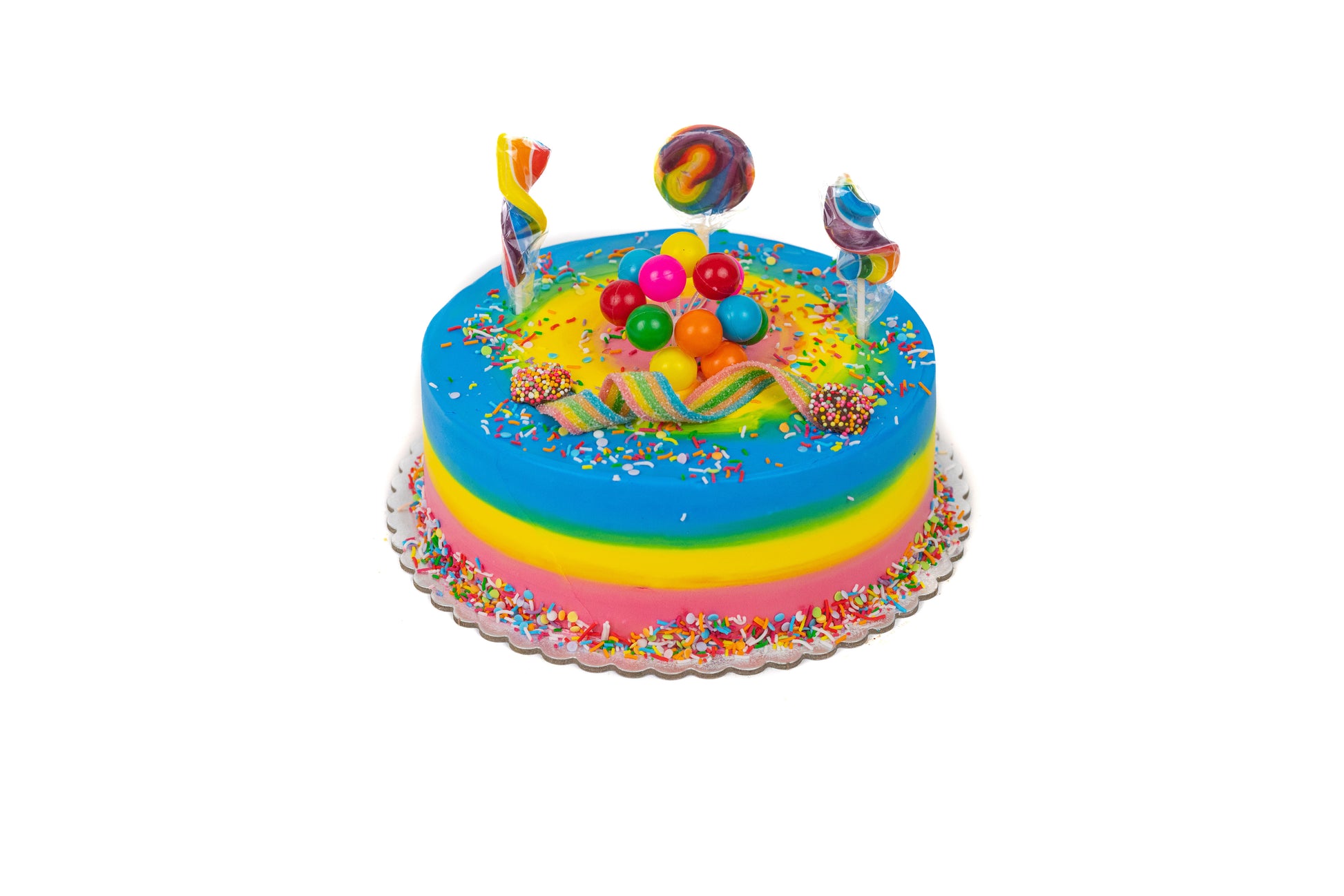 Coloured vanilla sponge cake with fresh cream layers, decorated with a rainbow continental finish and rainbow lollies. One of our most popular cakes, this cake is great for kids!